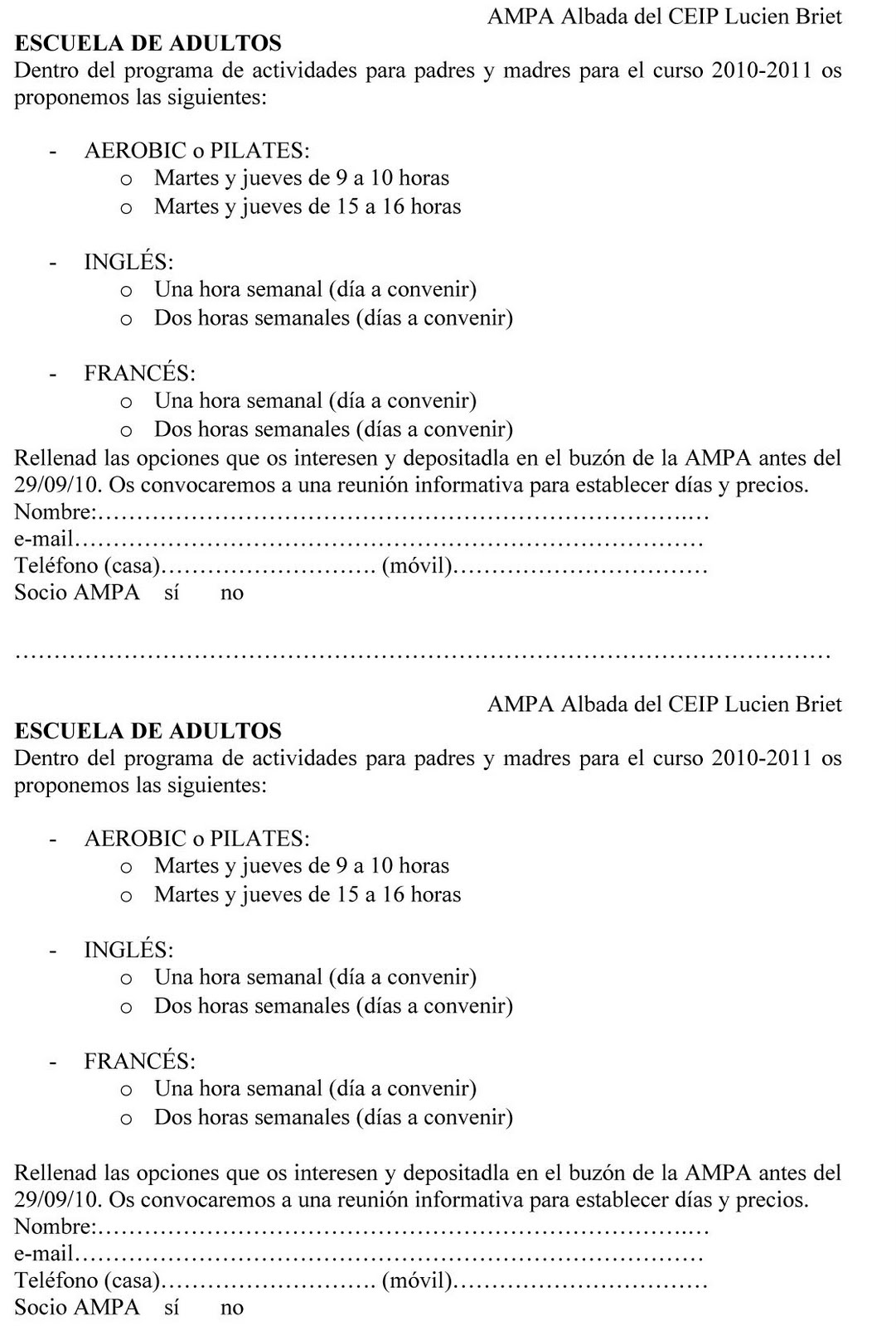 Rellenad las opciones que os interesen y depositadla en el buzón de la AMPA antes del 29/09/10. Os convocaremos a una reunión informativa para establecer días y precios.