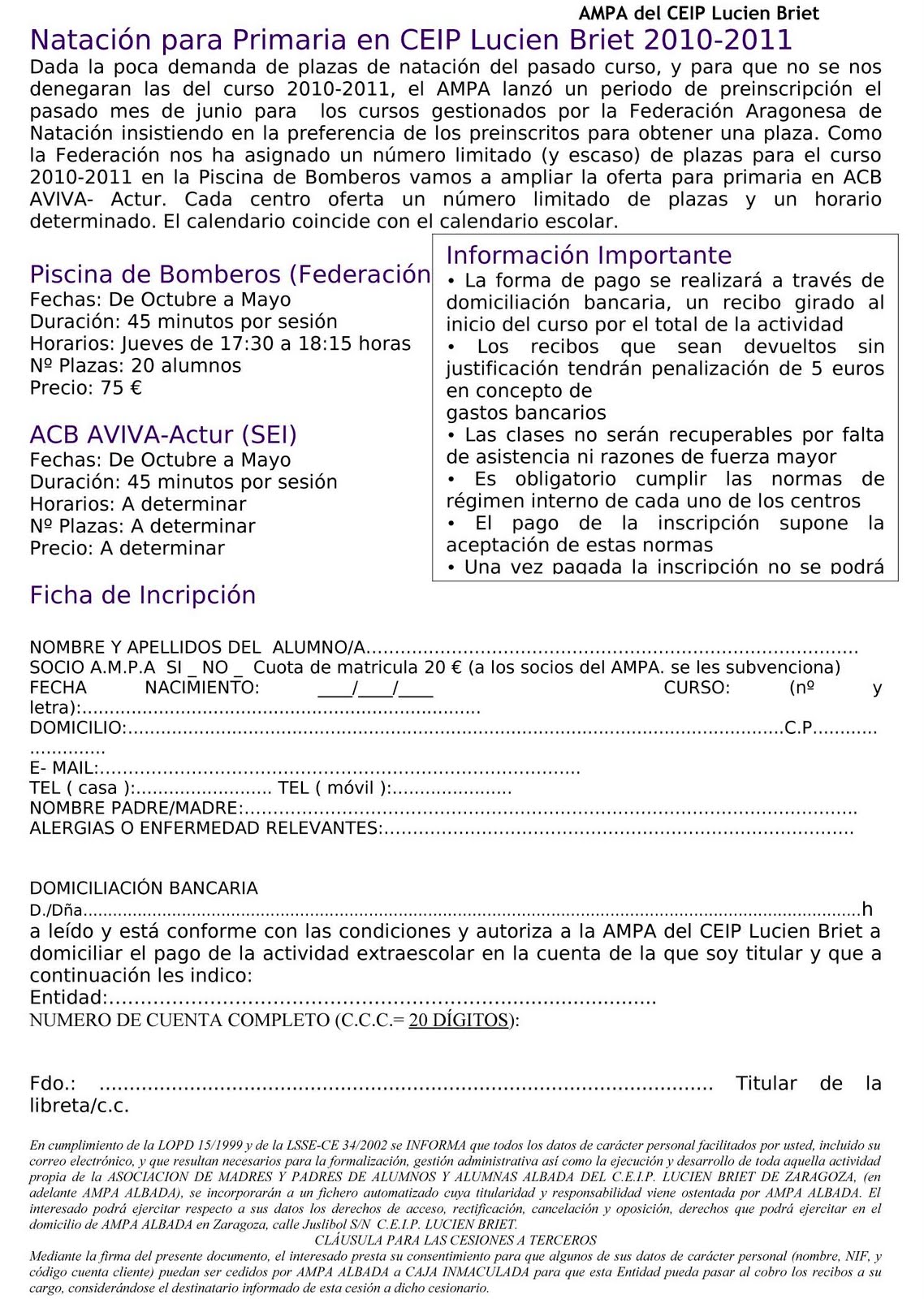 Coincido en el comentario de MariLuz sobre los cursillos de natación. Pienso como ella que la información llega tarde y para mi además no ha sido clara. En mi caso particular a la vista del cuadernillo de extraescolares donde no se comentaba nada de la natación de primaria (lo único que se conocía era la preinscripción que se hizo en mayo para la piscina del Parque Deportivo Ebro los viernes 75euros) me apunté a lo que encontré esa semana de forma privada y la verdad es que si hubiera sabido lo que íbais a sacar me hubiera esperado. Resumiendo que para mí no se ha gestionado bien aunque desde luego valoro todo lo que habeís conseguido y el trabajo que os ha costado.