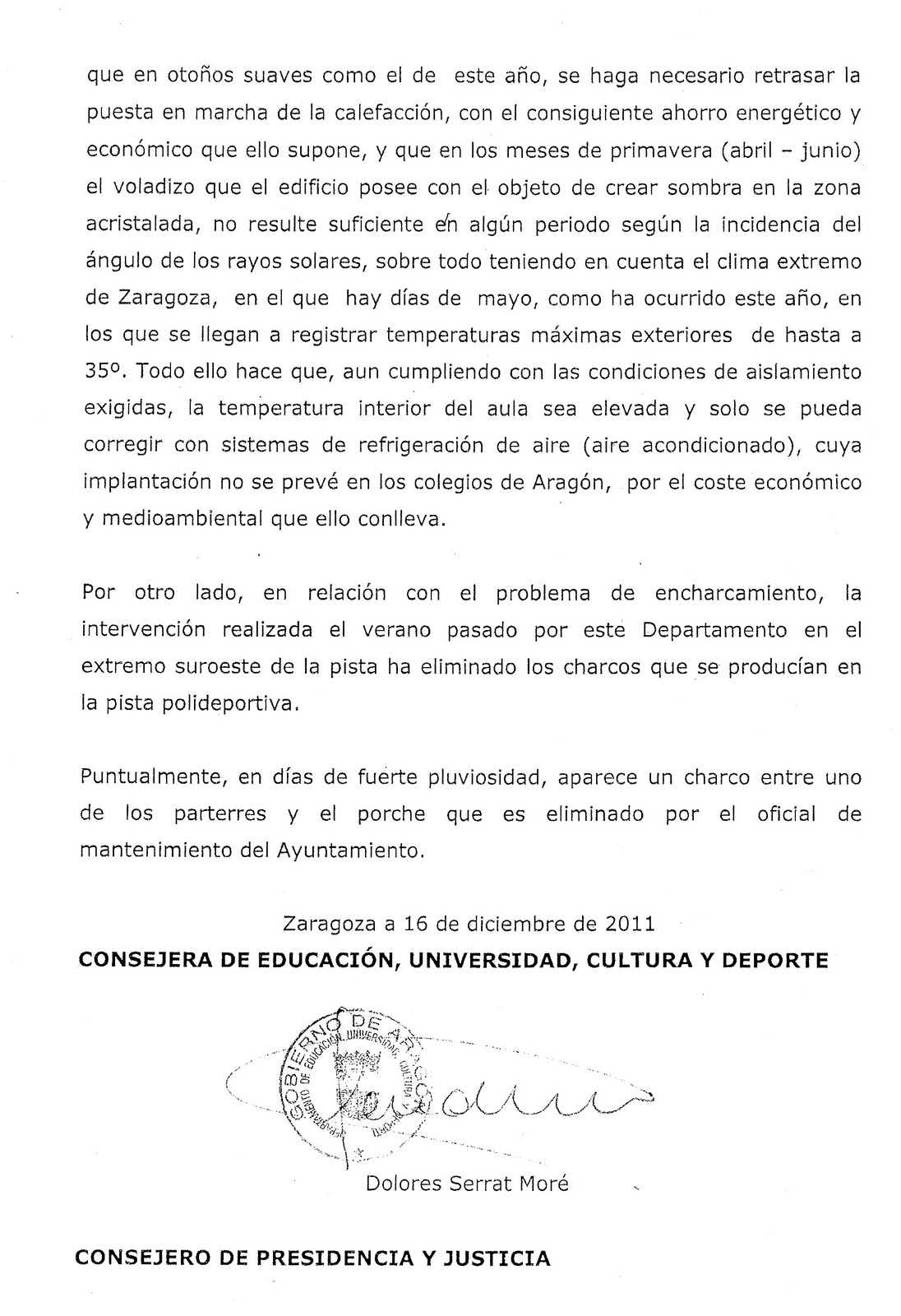 Los representantes de los padres, junto al AMPA, hemos dado un paso recurriendo a las Cortes de Aragón. En virtud de ésto nos visitó en Diciembre el diputado Gregorio Briz. Este registró en las Cortes una pregunta y la petición de obtener los informes que los departamentos técnicos hayan elaborado sobre estos problemas.