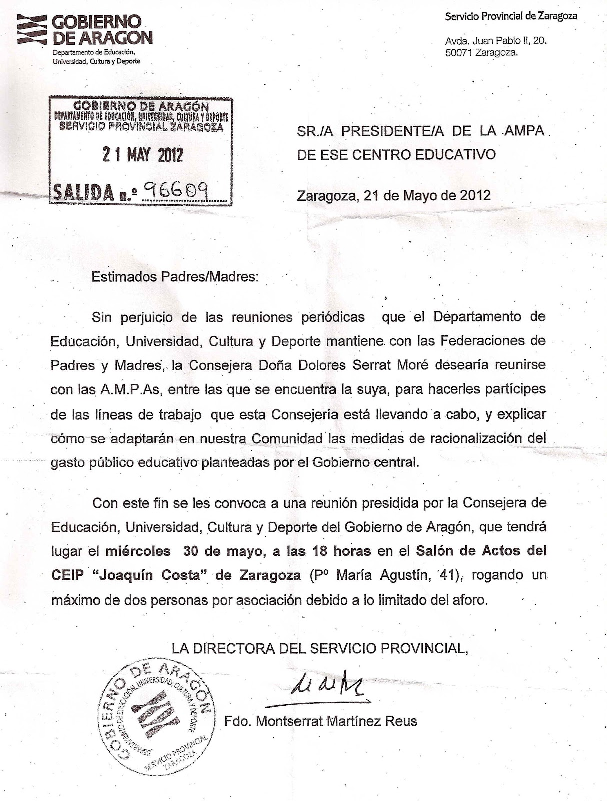Hoy a las 18:00 el AMPA del Lucien Briet estaba convocada, junto a todas las AMPAS de Zaragoza (pública y concertada), a una reunión con la consejera Dolores Serrat en el CEIP Joaquín Costa.