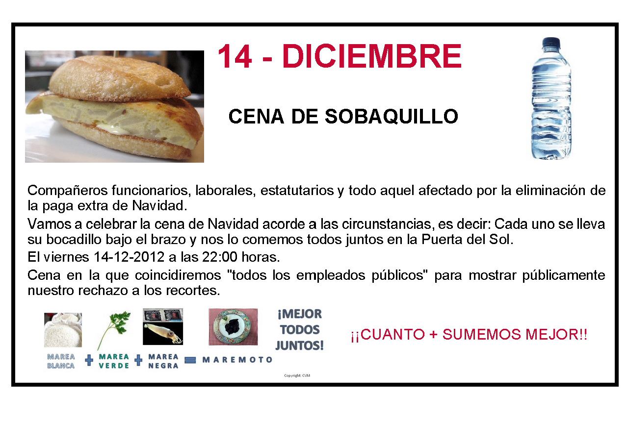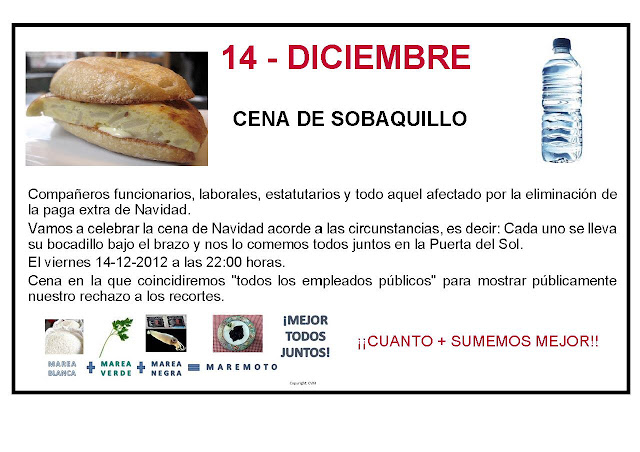 La iniciativa parece que partió hace unos días de Teruel, pero se está extendiendo por el resto de España. Las distintas mareas, que agrupan a colectivos de empleados públicos, han convocado una ‘cena de sobaquillo’ el próximo día 14 para celebrar a su manera la Navidad, cada cual con su bocadillo y su bebida para no gastar ni un euro. Una forma de protestar contra los recortes en Educación y los sablazos que está recibiendo el colectivo de interinos, que el Gobierno de Aragón ha decidido quitarles la paga de verano.