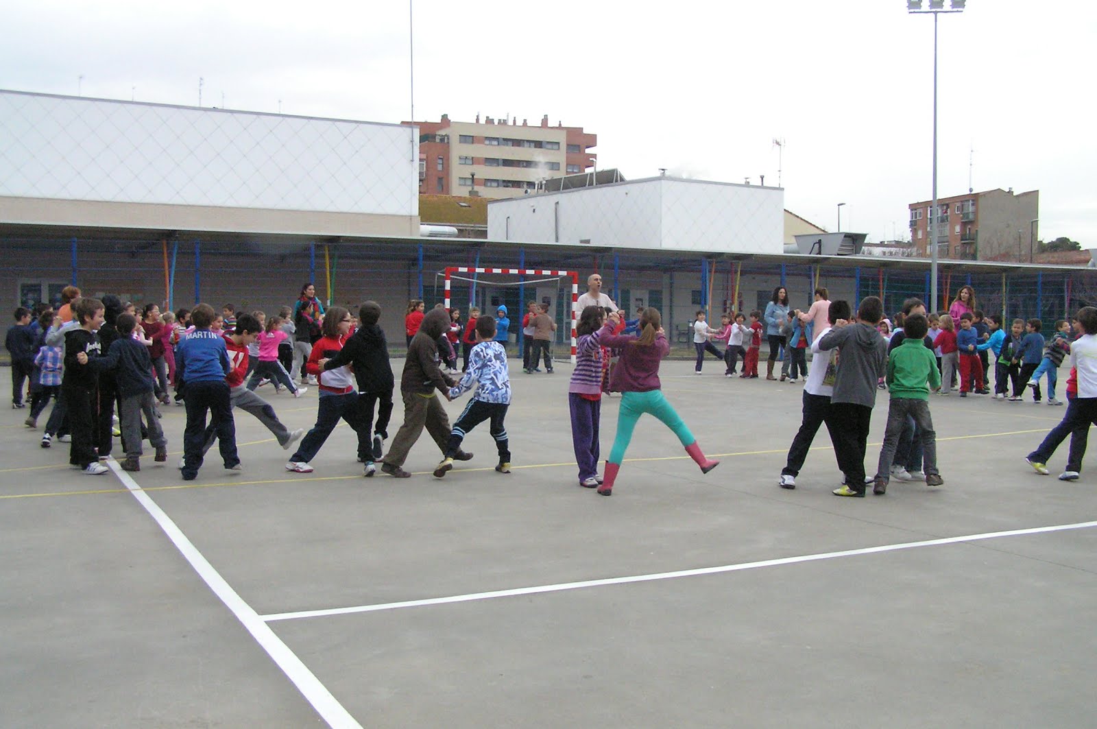 un baile todos juntos en el patio.