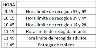 3º CÁMARA DE LLAMADAS. Estas son las horas límites de recepción de corredores. Se irán llamando por orden de carrera. Las llamadas se harán por ciclos. Los niños se recogerán cuando terminen TODAS las carreras y empezando de los más pequeños a los más mayores.