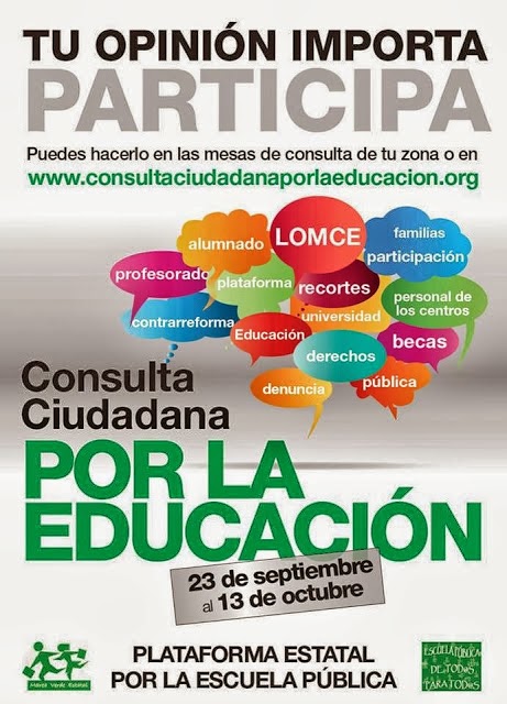 Por eso os pedimos a vosotros (padres, madres, profesores, personal de mantenimiento, limpieza, monitoras de comedor, equipo directivo…) y a todos que conozcáis mayores de 14 años que os unáis a la consulta ciudadana que se está celebrando estos días en Zaragoza y a nivel Estatal. Vuestra opinión se hará llegar al Presidente de Gobierno el 17 de Octubre.