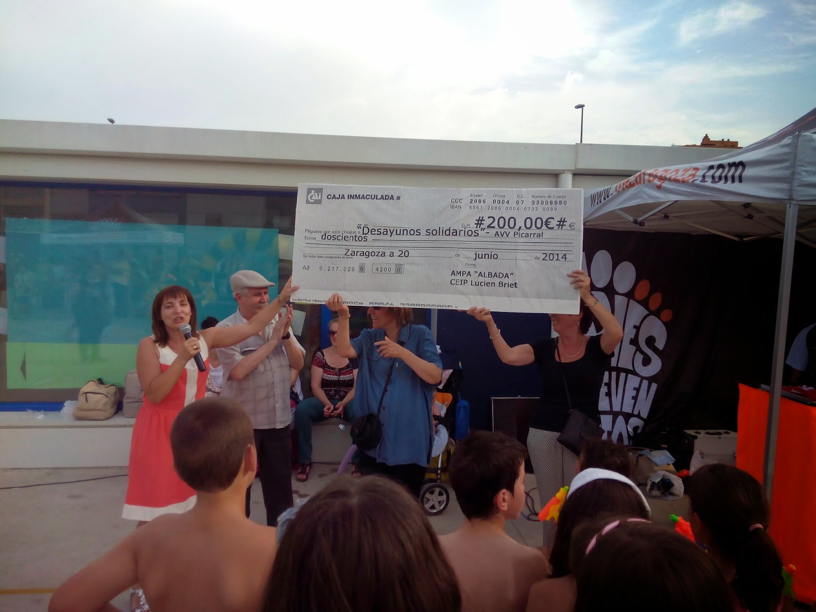 A las 19:00 se hizo una pequeña pausa para proceder a la entrega de un «cheque» de 200€ al Proyecto «Desayunos Solidarios» de la A.V.V. Picarral «Salvador Allende». Este dinero se corresponde al 0,7% del presupuesto del AMPA «ALBADA» que se acordó de manera unánime en la asamblea de socios de octubre del 2013 de usar para fines sociales. La junta pensó que este año era un buen proyecto por dos razones: por ir dirigido a los niñ@s de nuestro barrio y por otro lado para estrechar lazos con la Asociación de Vecinos con la que estamos colaborando en más proyectos (cesión de aulas para extraescolares, etc).