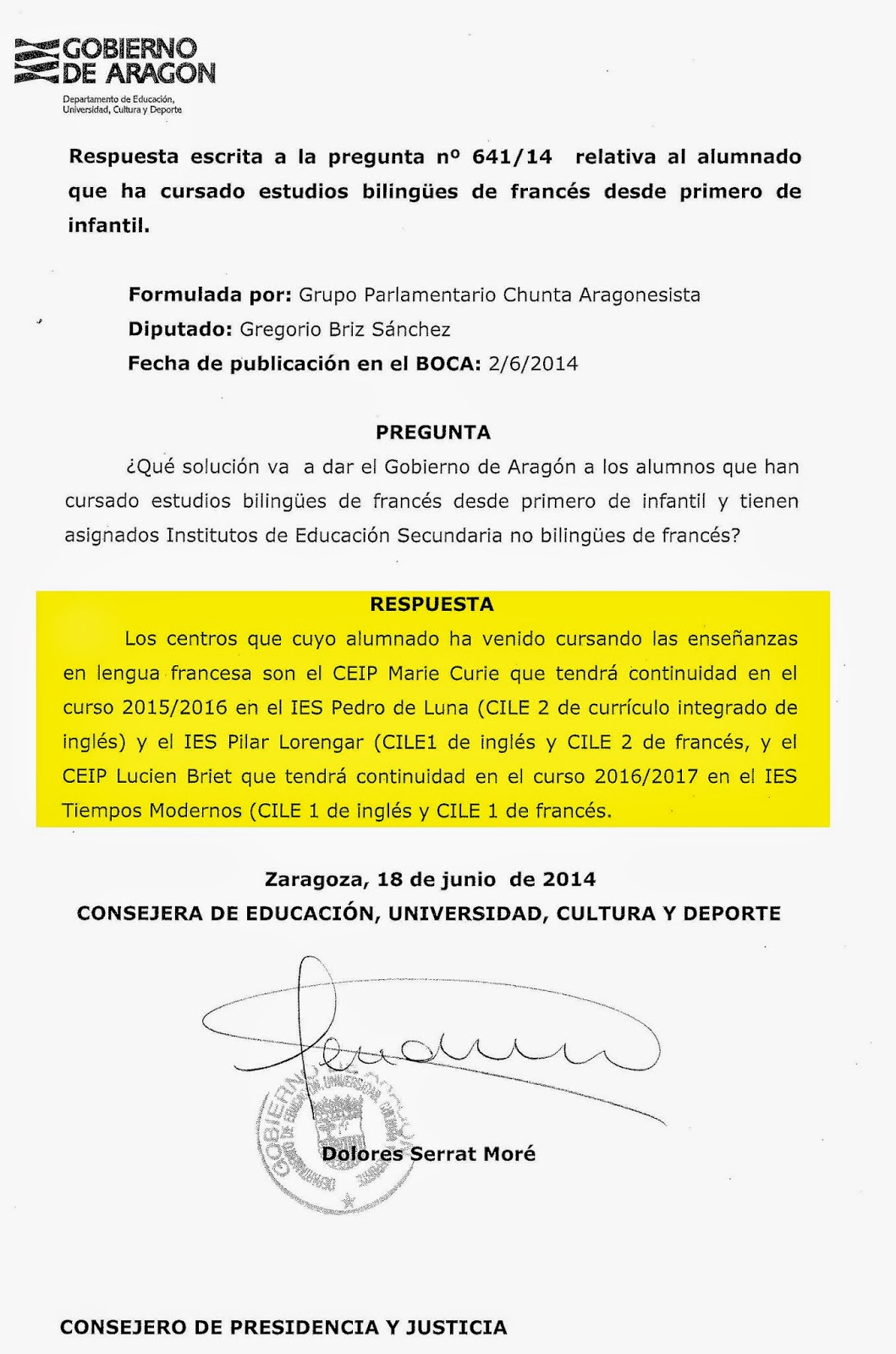 Recordad que CILE 1 significa que se imparte un área del curriculo en lengua extranjera además de la lengua extranjera. Por ejemplo, pueden dar inglés como lengua extranjera y luego conocimiento del medio en francés como bilingüe. Curiosamente en la respuesta se olvidan de comentar donde estudiarán los alumnos del CEIP SAN BRAULIO… Igual se piensan que están en las Delicias…