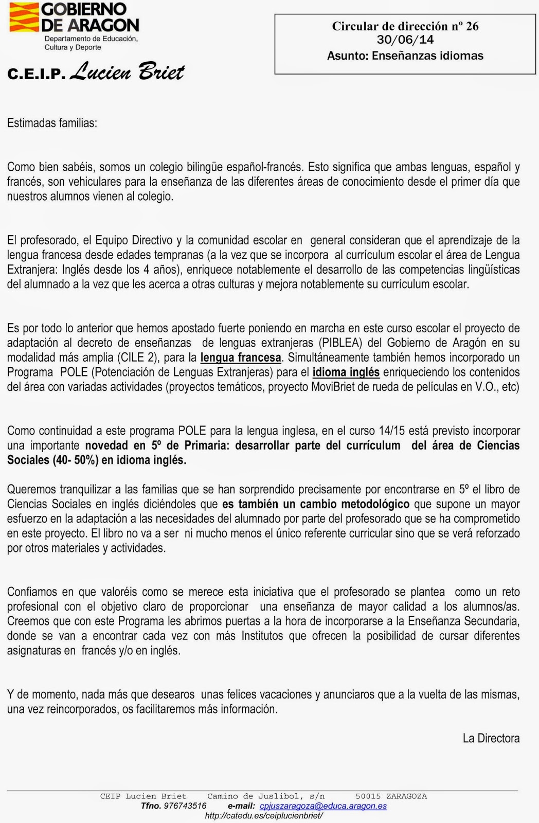 Me gustaría que también se tuviera en cuenta la opinión de los padres que creemos que la decisión de impartir la asignatura de sociales en inglés, es un verdadero regalo para nuestros hijos. Me ha sorprendido que haya tantos padres que no estén de acuerdo con esto, considerando que muchos de ellos están pagando academias de inglés como actividad extraescolar, precisamente porque están concienciados de la importancia de los idiomas. Que un colegio público nos esté ofreciendo una oportunidad como ésta, me parece -repito- un auténtico regalo para los alumnos.