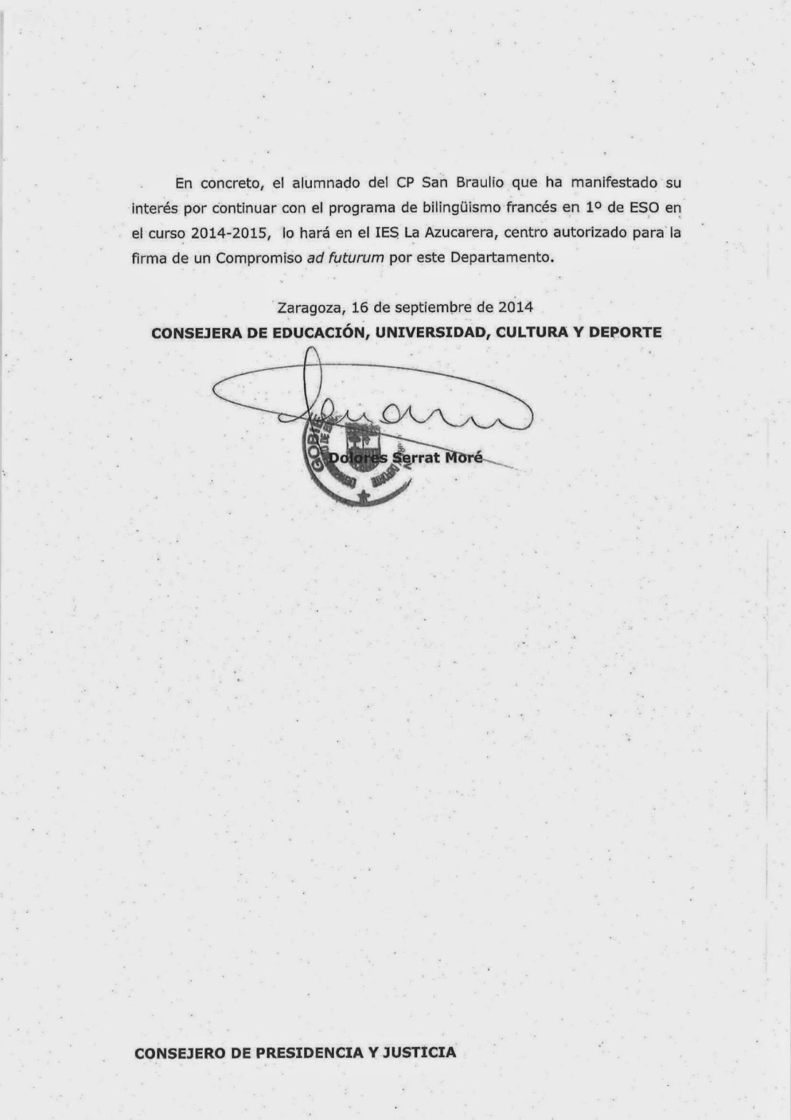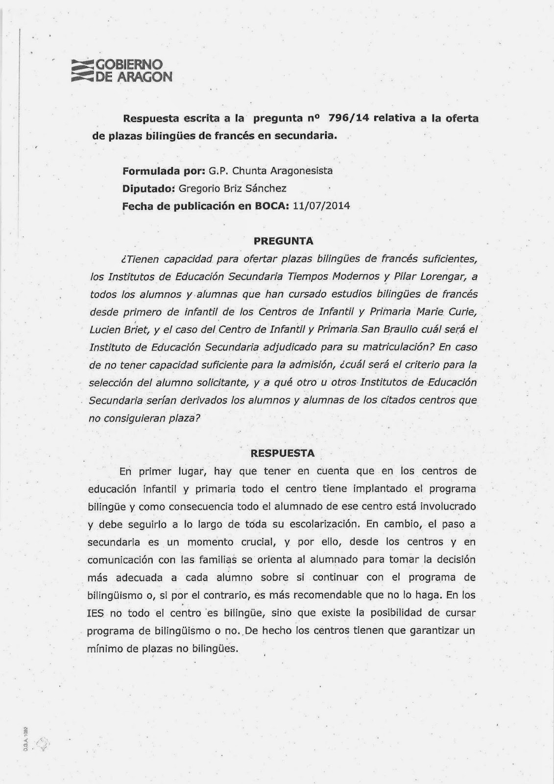 El diputado de CHA Gregorio Briz volvió a preguntar a la consejera Serrat sobre algo que nos preocupa mucho: ¿continuarán nuestros hijos con el programa bilingüe de francés cuando pasen al instituto?