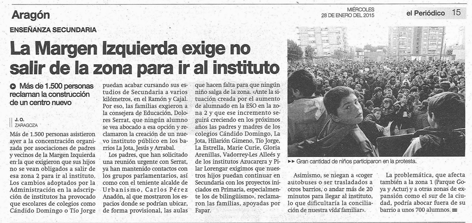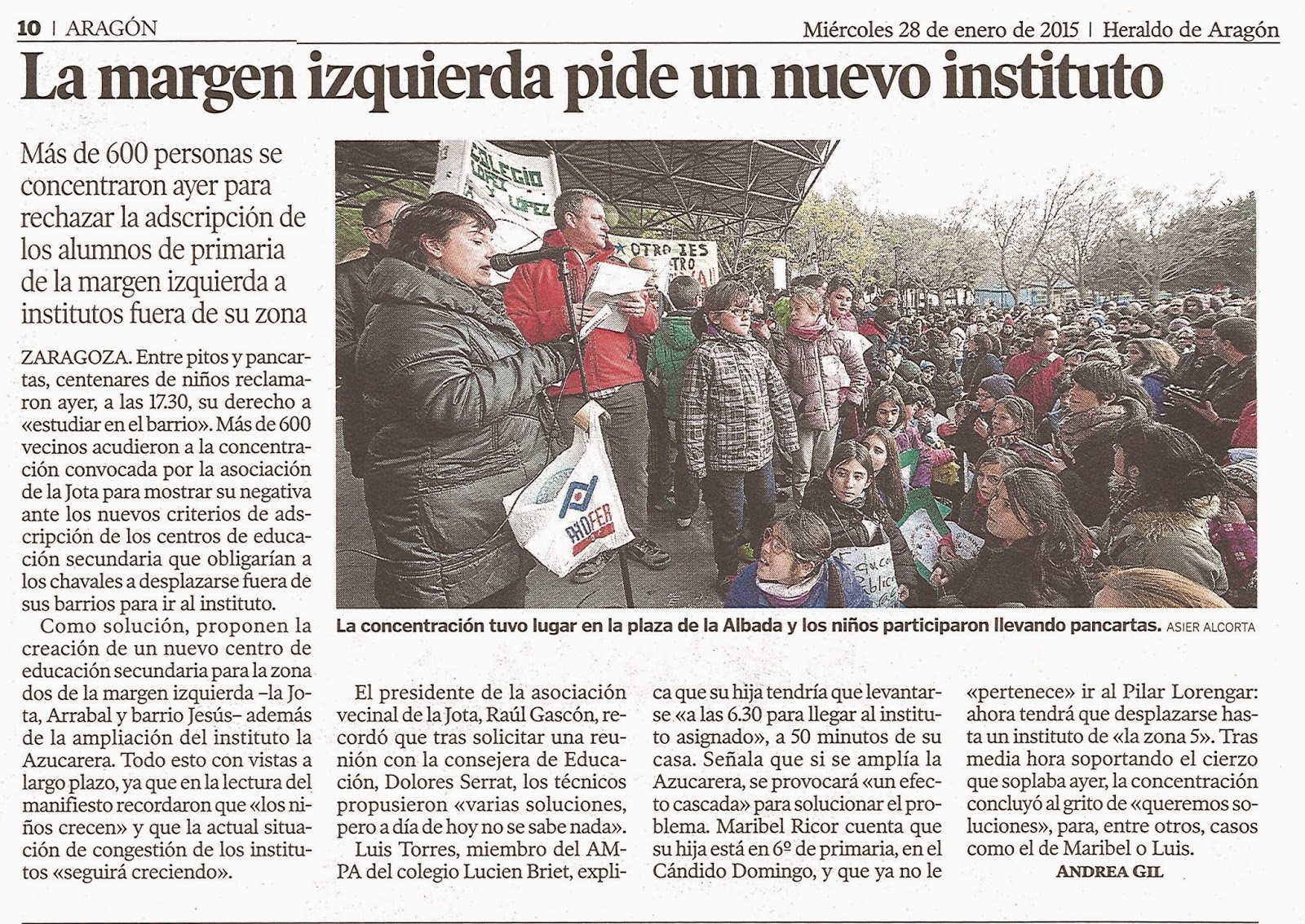 Hace más de un año que las asociaciones de vecinos del Barrio de la Jota y del Barrio Jesús, empezaron a colaborar con las AMPAS de los colegios públicos de su zona, al percatarse de una realidad abrumadora que iba a obligar a las familias de la zona a desplazar a los niños de secundaria en algunos casos más de 3 KM de su vivienda, para poder continuar con sus estudio ( no olvidemos , obligatorios ). Debido a la FALTA DE PLAZAS DE LA ZONA.