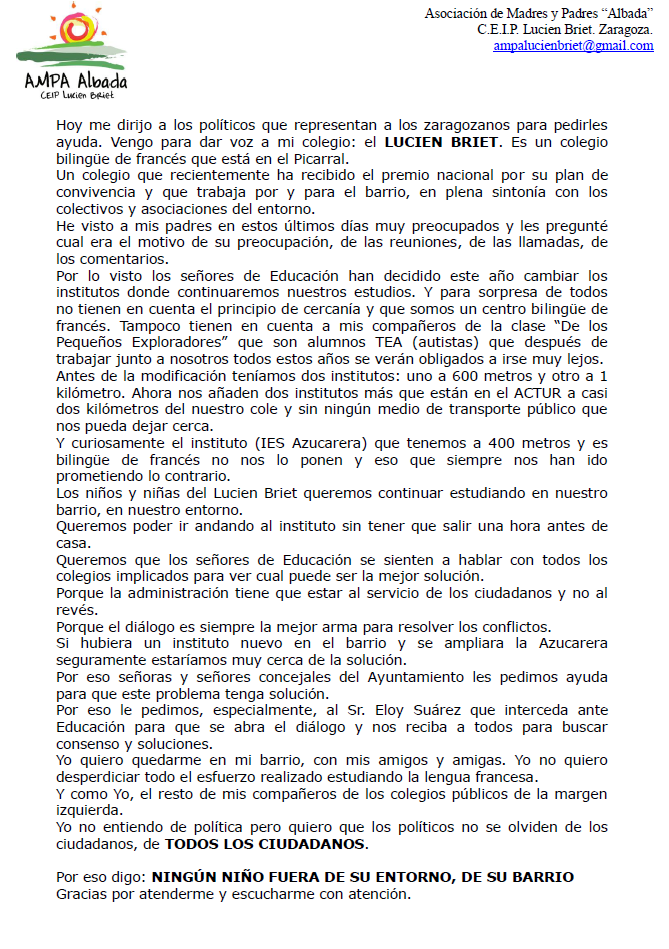 una representación de AMPAS, FAPAR (federación de AMPAS) y Asociaciones de vecinos de la margen izquierda, tuvimos la oportunidad, gracias a una moción presentada por la CHA , tras las nuevas adscripciones a los institutos de los colegios públicos, de hacernos oír en el pleno del ayuntamiento ante el Alcalde de Zaragoza y los Concejales de los distintos partidos políticos.