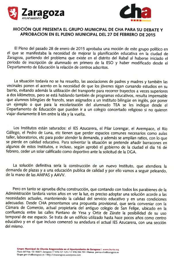 MOCIÓN QUE PRESENTA EL GRUPO MUNICIPAL DE CHA PARA SU DEBATE Y APROBACIÓN EN EL PLENO MUNICIPAL DEL 27 FEBRERO DE 2015