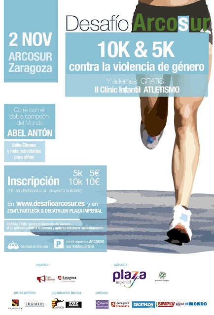 El próximo lunes 2 de noviembre de 2015 se celebrará en Arcosur (Zaragoza), la segunda edición del Desafío Arcosur Contra la Violencia de Género,sobre unas distancia no homologada por la RFEA de 10km y 5km. Grupo Arqueros, Plaza Imperial y Arcosur Zaragoza promueven este evento deportivo, que cuenta con la organización de Zaragoza Atletismo y la Federación Aragonesa de Atletismo, prueba que se incluye en el calendario autonómico con la autorización de la Federación Aragonesa de Atletismo y bajo el control del Comité de Jueces de la FAA. El clinic escolar está incluido dentro de la campaña Atletismo en el Cole.