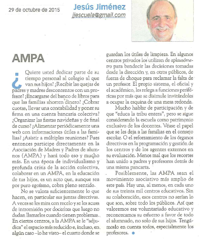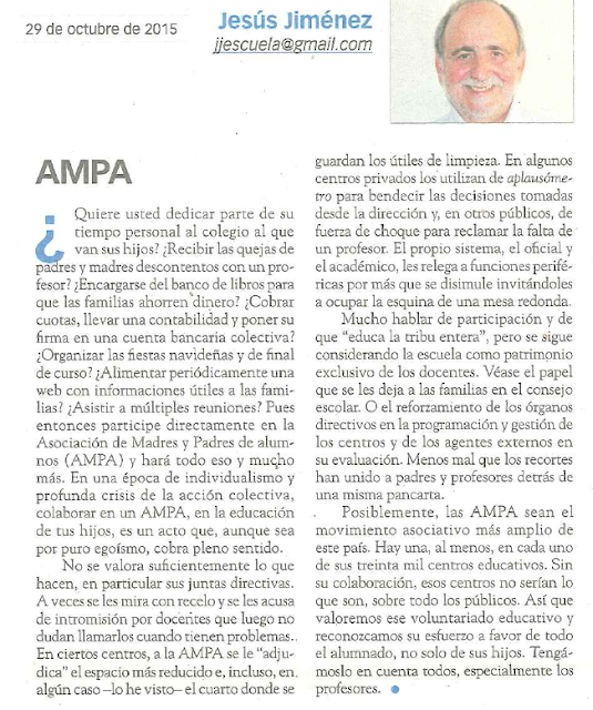 Desde FAPAR nos envían este recorte está sacado de la Revista Escuela en la que colabora un inspector de Aragón, Jesús Jiménez, que en este número dedica a las AMPAS su reflexión.