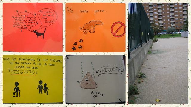 El pasado lunes,alumnos de 6ºB primaria, al comenzar el tema 3 de lengua con los carteles (como códigos lingüísticos) se les ocurrió (de forma voluntaria) preparar unos carteles para la valla que da al centro de jubilados. . .el terreno es un «campo de minas de excrementos caninos».
