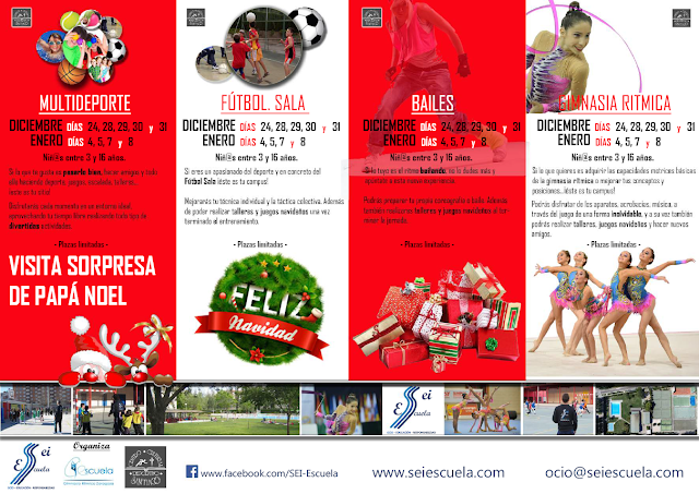 9 días llenos de sorpresas, entretenimiento y diversión, con la visita sorpresa de Papá Noel, talleres y juegos navideños. A complementar con esto puedes elegir entre: campus de multideporte, fútbol sala, baile moderno o gimnasia rítmica.