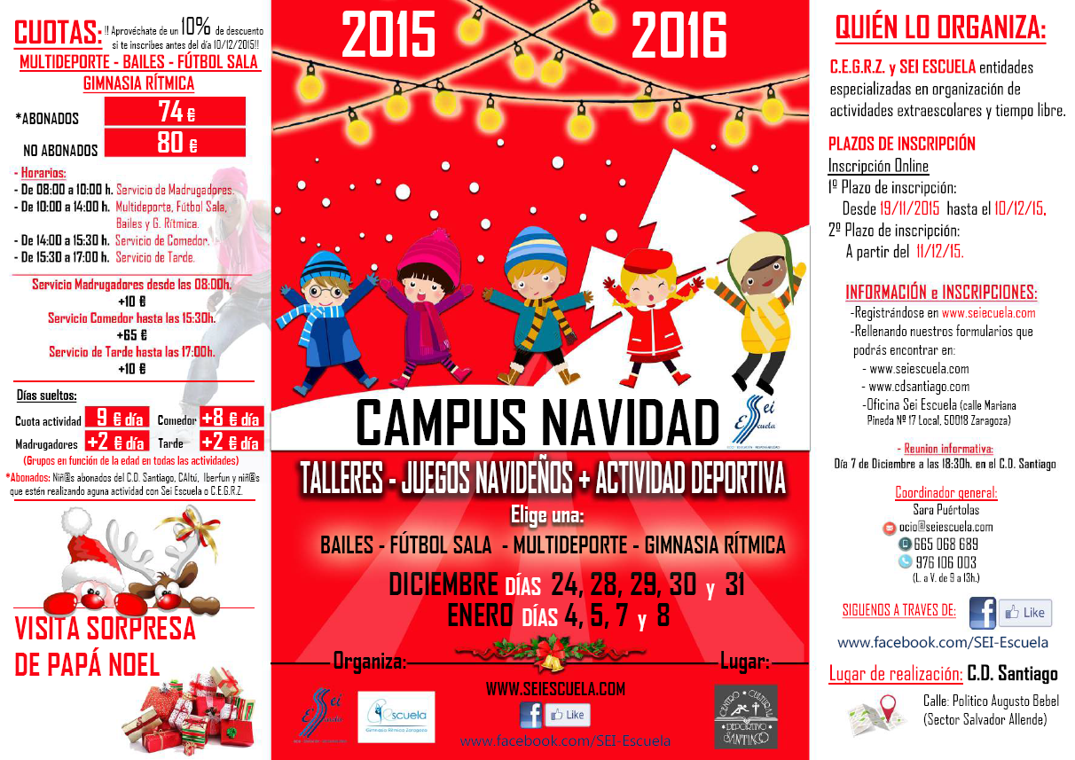 9 días llenos de sorpresas, entretenimiento y diversión, con la visita sorpresa de Papá Noel, talleres y juegos navideños. A complementar con esto puedes elegir entre: campus de multideporte, fútbol sala, baile moderno o gimnasia rítmica.