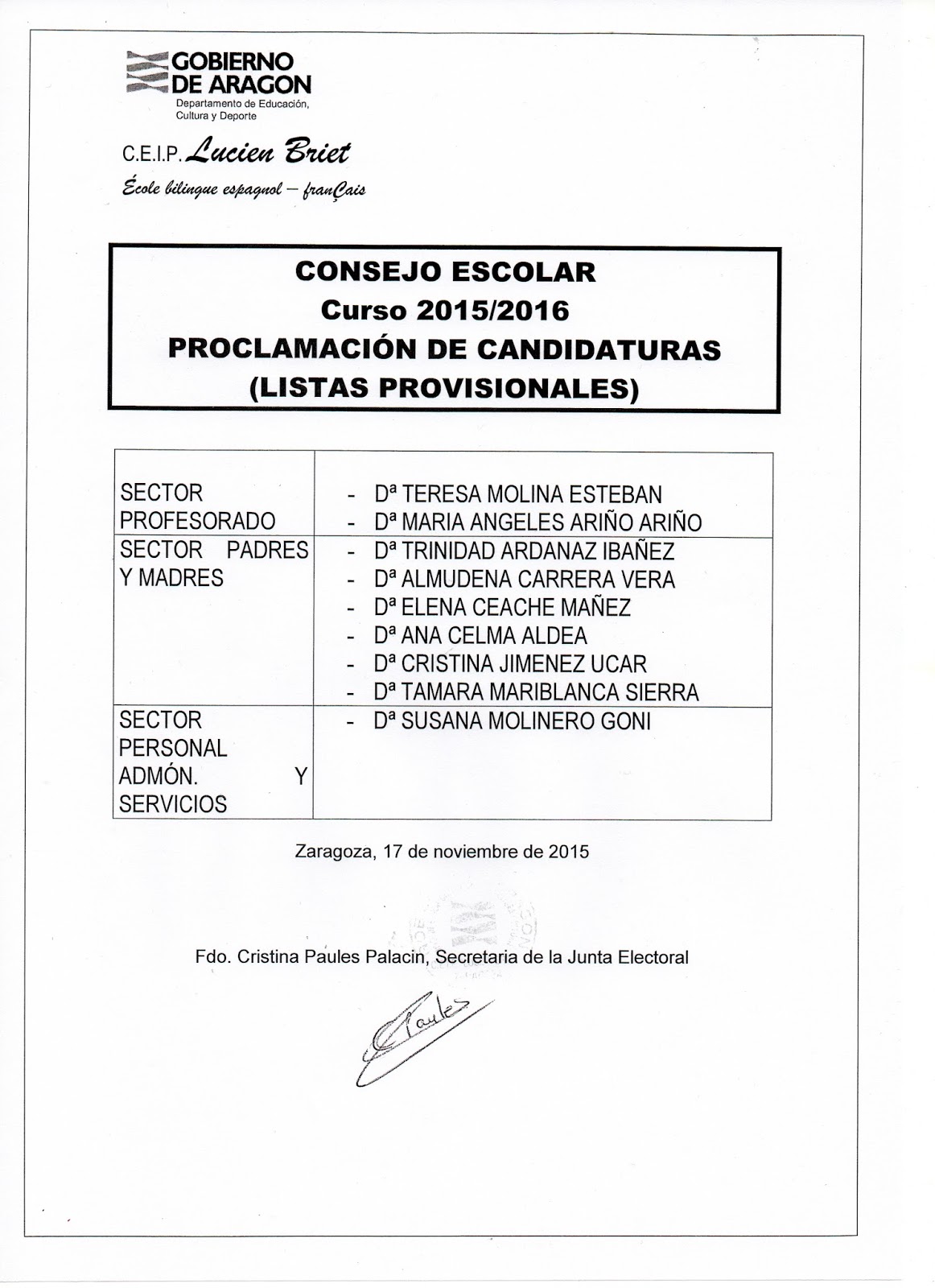 LISTA PROVISIONES DE CANDIDATURAS – CONSEJO ESCOLAR 2015/2016