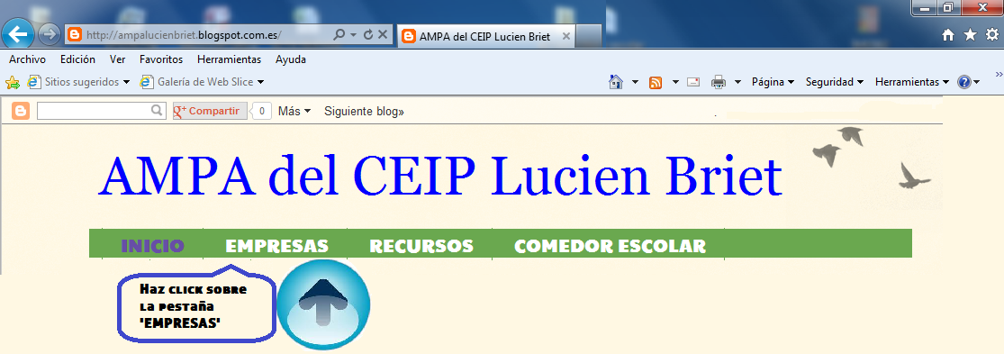 Debajo del titulo ‘AMPA del CEIP Lucien Briet’ se encuentra un menú de pestañas. Haciendo click sobre la pestaña ‘EMPRESAS’ se abrirá una nueva ventana de vuestro navegador mostrando el BANCO de EMPRESAS que nos ofrecen actualmente algún tipo de promoción.