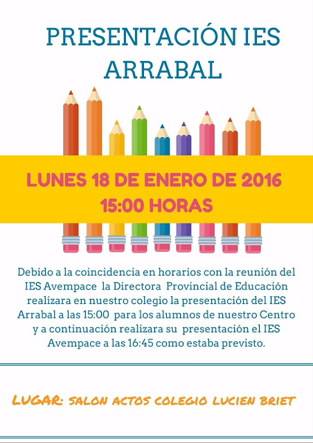 Es para las familias , me refería que era solo para este centro la presentación. Al primer comentario te contestare simplemente que sigue la reunión de las 18:00 h en el cc Estación Norte a la que igualmente podrás acudir, podías haber empezado preguntándolo. La Consejera ha tenido la deferencia de venir a nuestro colegio a hacer la presentación al ver que había programada una reunión con el IES Avempace con la que se podia solapar y para no entorpecer la asistencia de padres a las reunión del Avempace. Saludos