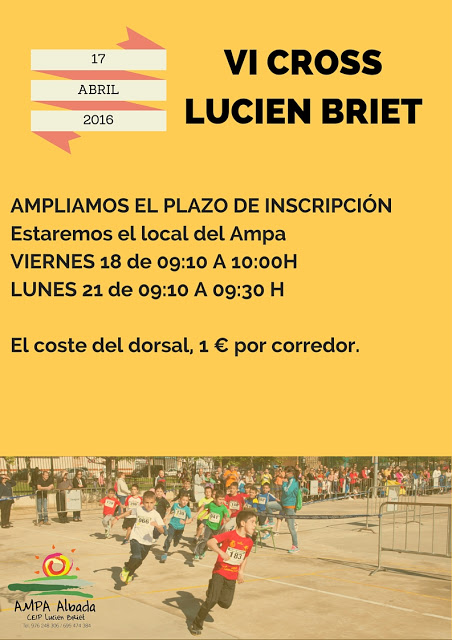Debido a que después de cerrar el plazo de inscripción han sido varias la personas que nos han comentado que no han podido pasarse por el ampa a retirar los dorsales para la carrera ampliamos el plazo hasta el lunes 21. La fecha limite sera el lunes 21 ya que tenemos que realizar los encargos de los regalos para los participante como maximo esa fecha para que puedan estar listos el dia de la carrera.