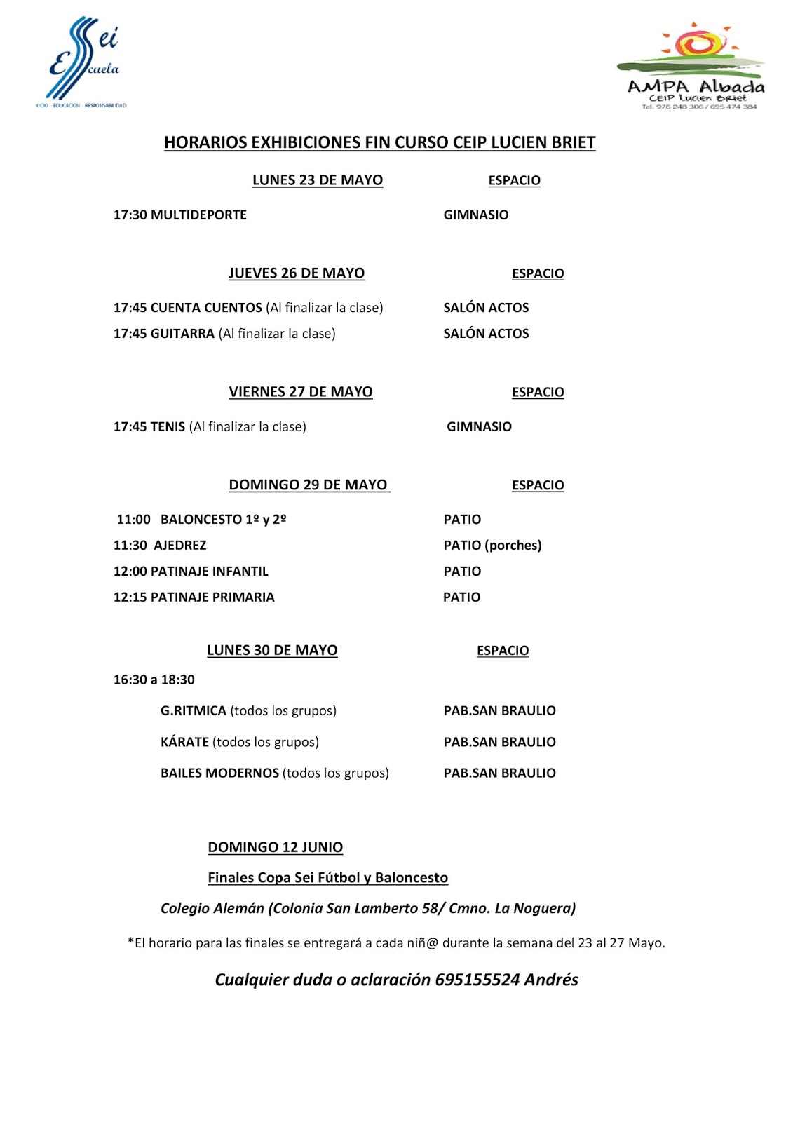 HORARIOS EXHIBICIONES FIN CURSO CEIP LUCIEN BRIET