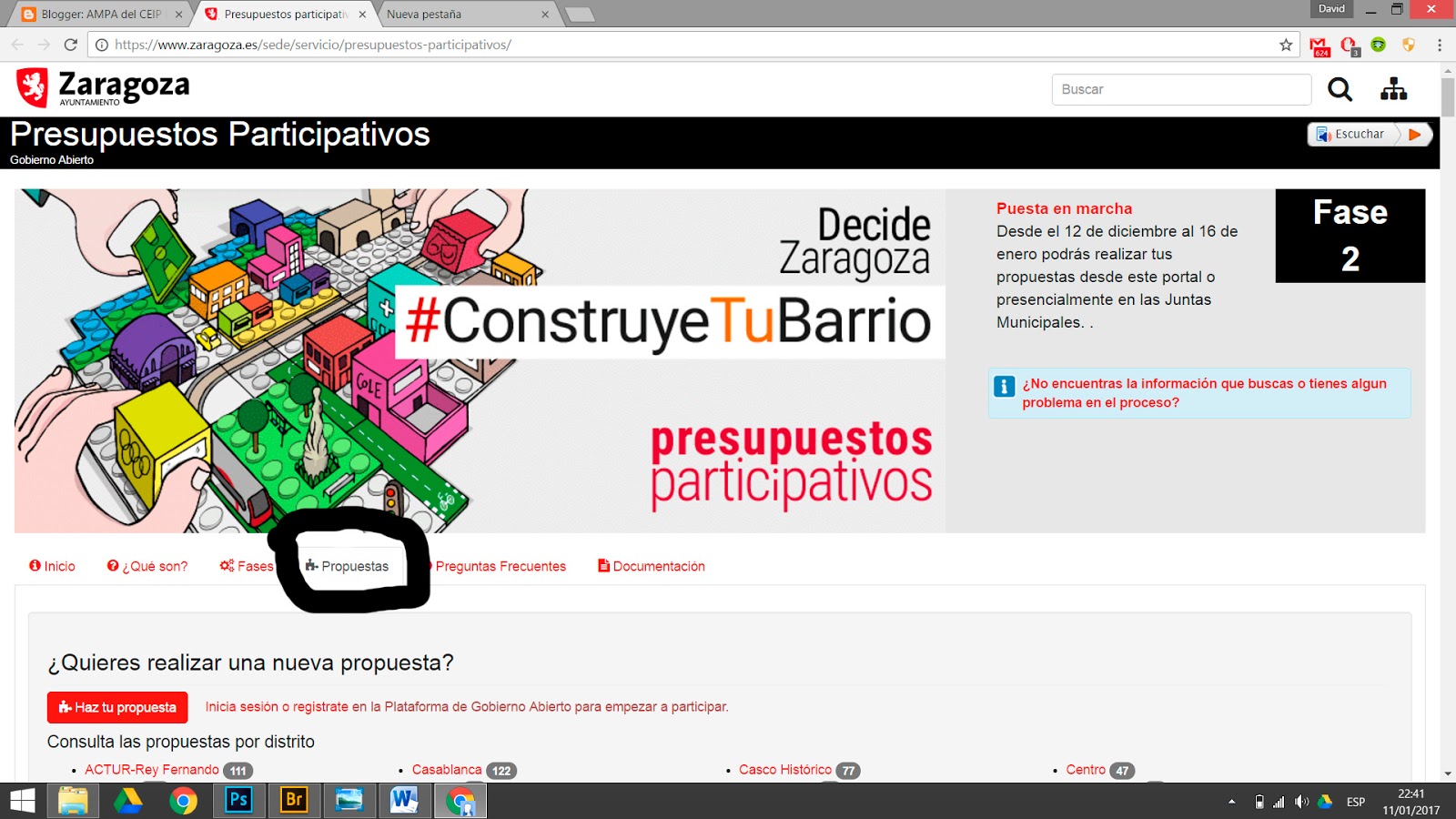 El plazo para votar las PROPUESTAS presentadas por asociaciones y particulares de nuestro Distrito, al amparo de los PRESUPUESTOS PARTICIPATIVOS, finaliza el próximo 16 de Enero.