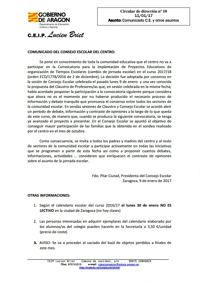 Convocatorias a Claustro y Consejo Escolar el 9/01/17… para decidir si se presenta o no dicho Proyecto