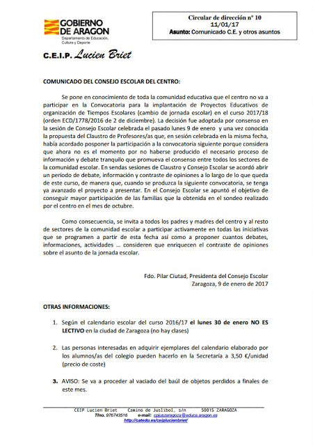Además te recuerdo que tras la aprobación de la LOMCE el consejo escolar es un órgano meramente consultivo de las decisiones del equipo directivo. En el caso que nos atañe el Consejo Escolar tiene importancia porque así que regulado en la Orden de la DGA (en virtud de sus competencias en materia de Educación) pero para el día a día se hace lo que el equipo directivo dice, sin posibilidad de discusión.