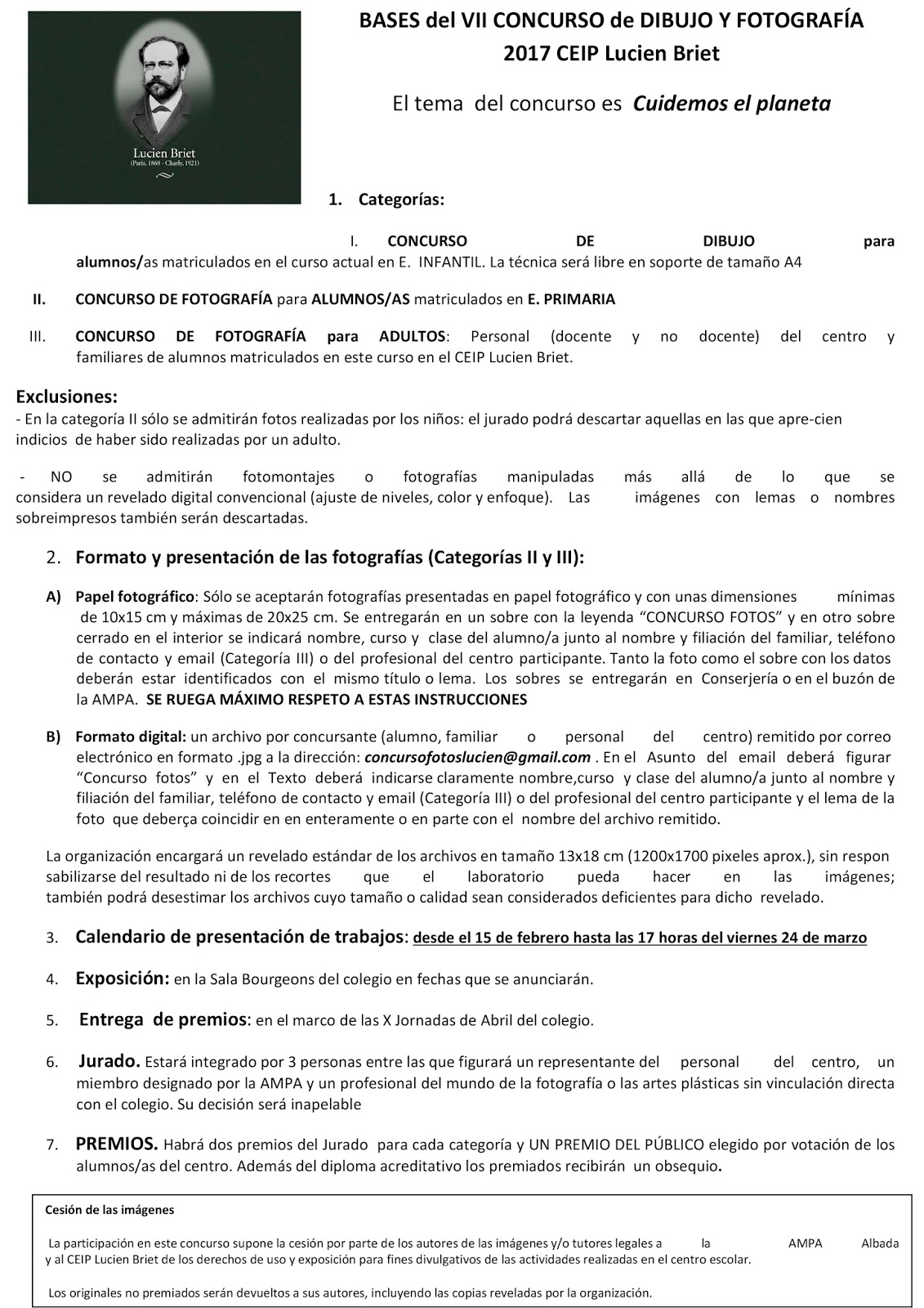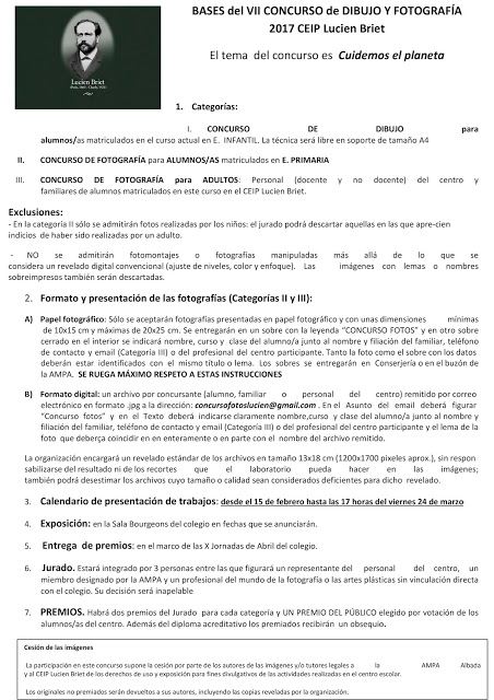 Del 15 de febrero al 24 de marzo podéis enviar vuestras fotografías (primaria y adultos) o dibujos ( para los niños de infantil) para el concurso de este año . El tema es «Cuidemos el planeta» sigue la linea del tema de este curso en el colegio «El medio ambiente». Podéis realizar fotografías relacionadas con el tema , sobre aspectos relacionados con el cuidado del medio ambiente que nos rodea , tanto de manera positiva como negativa, la orilla de un rio , un bosque , los residuos que están a nuestro alrededor .Esperamos vuestras imágenes y dibujos!!!!