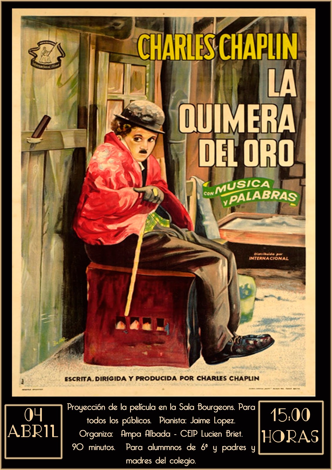 Este próximo martes 4 de abril a las 15:00 h se proyectara la película La quimera de oro en la sala Bourgeons, protagonizada por Charles Chaplin con el acompañamiento musical del pianista Jaime Lopez, para los alumnos de sexto de primaria y padres y madres del colegio hasta completar el aforo de la sala.