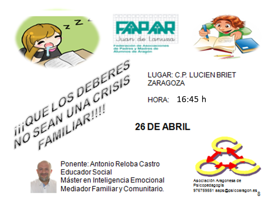 El día 26 de abril miércoles en la Sala Bourgeons el Ampa , dentro de las charlas programadas por Fapar, organiza la charla , ¡¡¡QUE LOS DEBERES NO SEAN UNA CRISIS FAMILIAR!! impartida por el Educador social Antonio Reloba Castro Master en Inteligencia Emocional y Mediador familiar y comunitario.