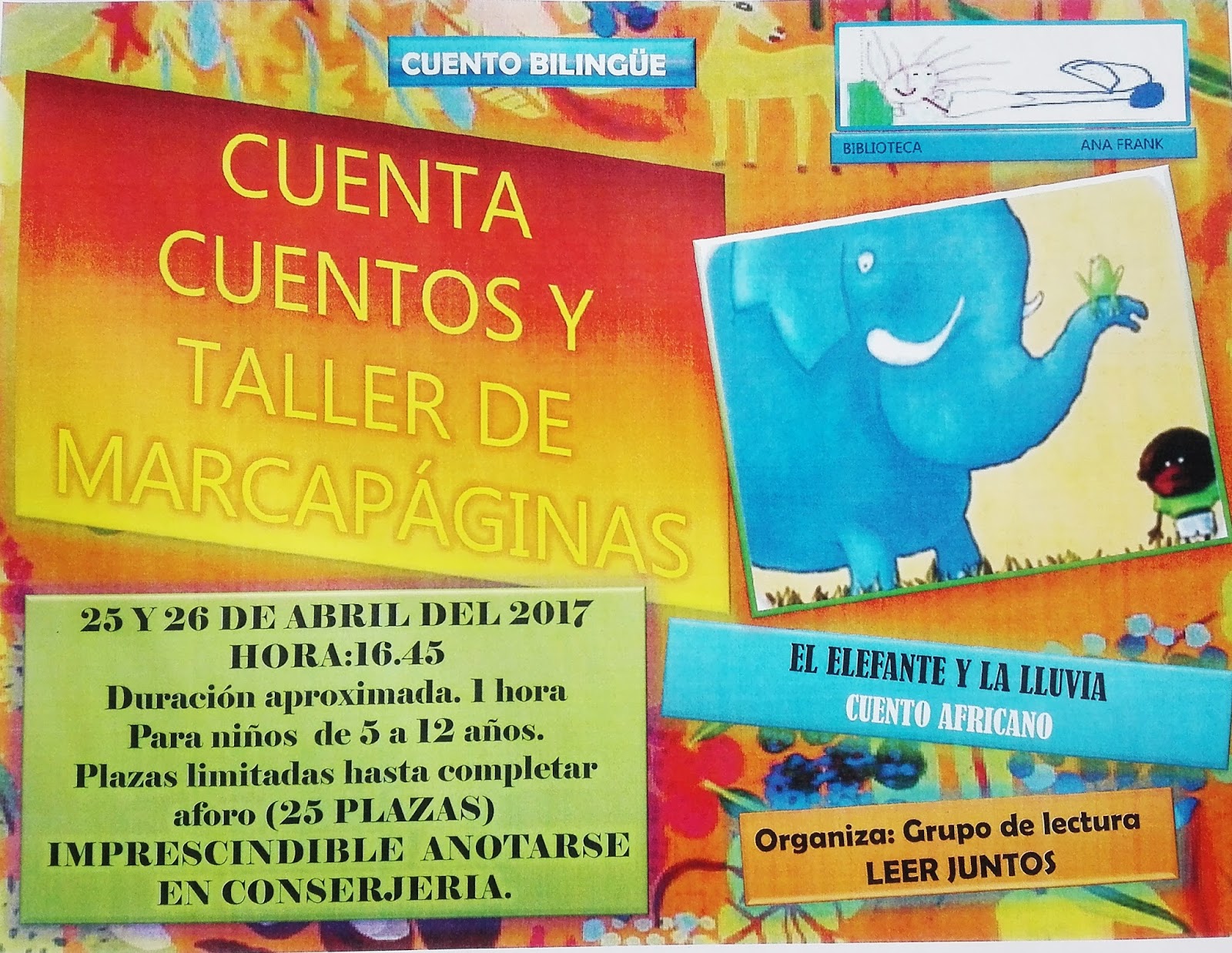 Dentro de la semana de Abril , el martes 25 de abril y el miércoles 26 abril el Grupo de Lectura del colegio realizará un Cuentacuentos , EL ELEFANTE Y LA LLUVIA (Cuento Africano) y un TALLER DE MARCA-PAGINAS . A las 16:45 h y con una duración aproximada de 1 hora. Tenéis que reservar plaza en Conserjería ya que el aforo máximo es de 25 personas.