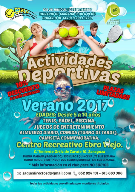 Os dejamos este cartel de las actividades deportivas que se van a realizar como otros años en el Centro Recreativo Ebro Viejo : Tenis, piscina, padel, juegos ……
