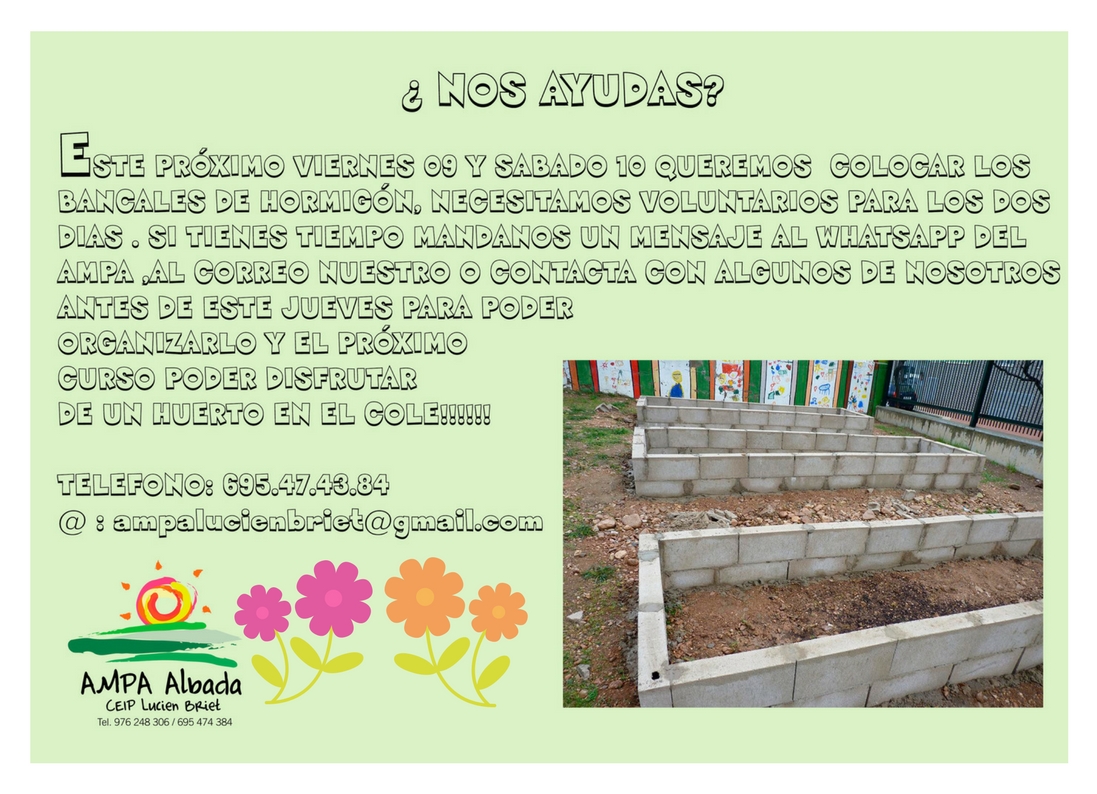 Hola , este viernes por la tarde y el sábado por la mañan a construiremos dos bancales como los que veis en la foto en el patio de primaria. Ya sabemos que hara un poquito de calor pero hasta ahora no hemos podido hacerlo, tenemos material , herramientas y el papa experto que nos ayudara pero nos faltan voluntarios, si tienes disponibilidad para acudir el viernes por la tarde y/o el sabado por la mañana , no lo dudes y contacta con nosotros , el curso que viene estrenaremos un huerto escolar para el cole, animaros!!!!