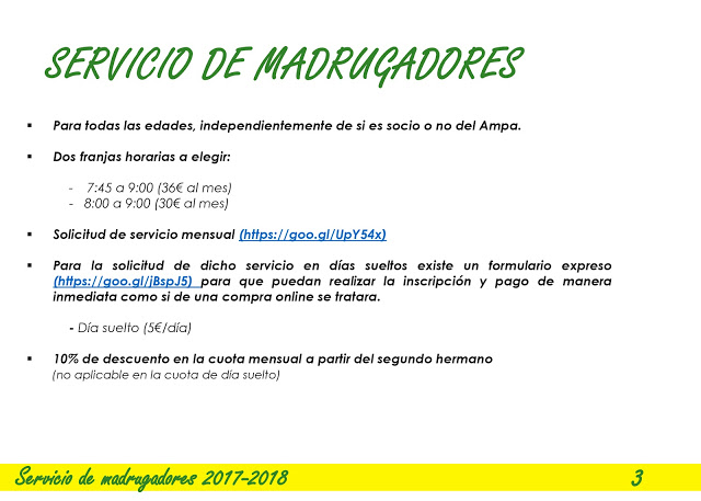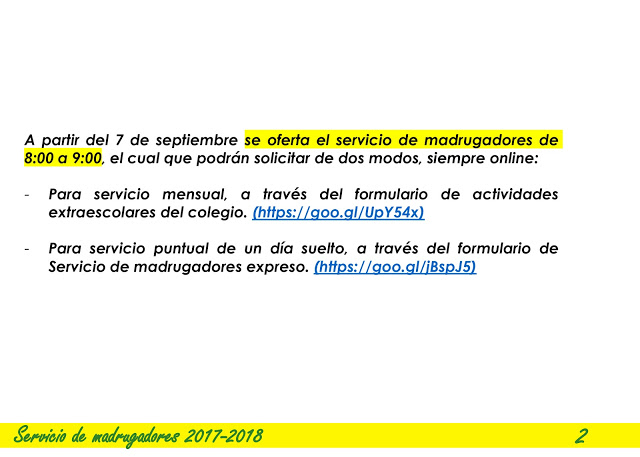 Os adjuntamos la información para el servicio de madrugadores de este curso que empieza en unos días , tenéis la opción de solicitud de servicio mensual o el formulario de días sueltos según os convenga, y toda la información mas abajo. Dejaremos una pestaña en la pagina principal para que podais realizarlo durante todo el curso .