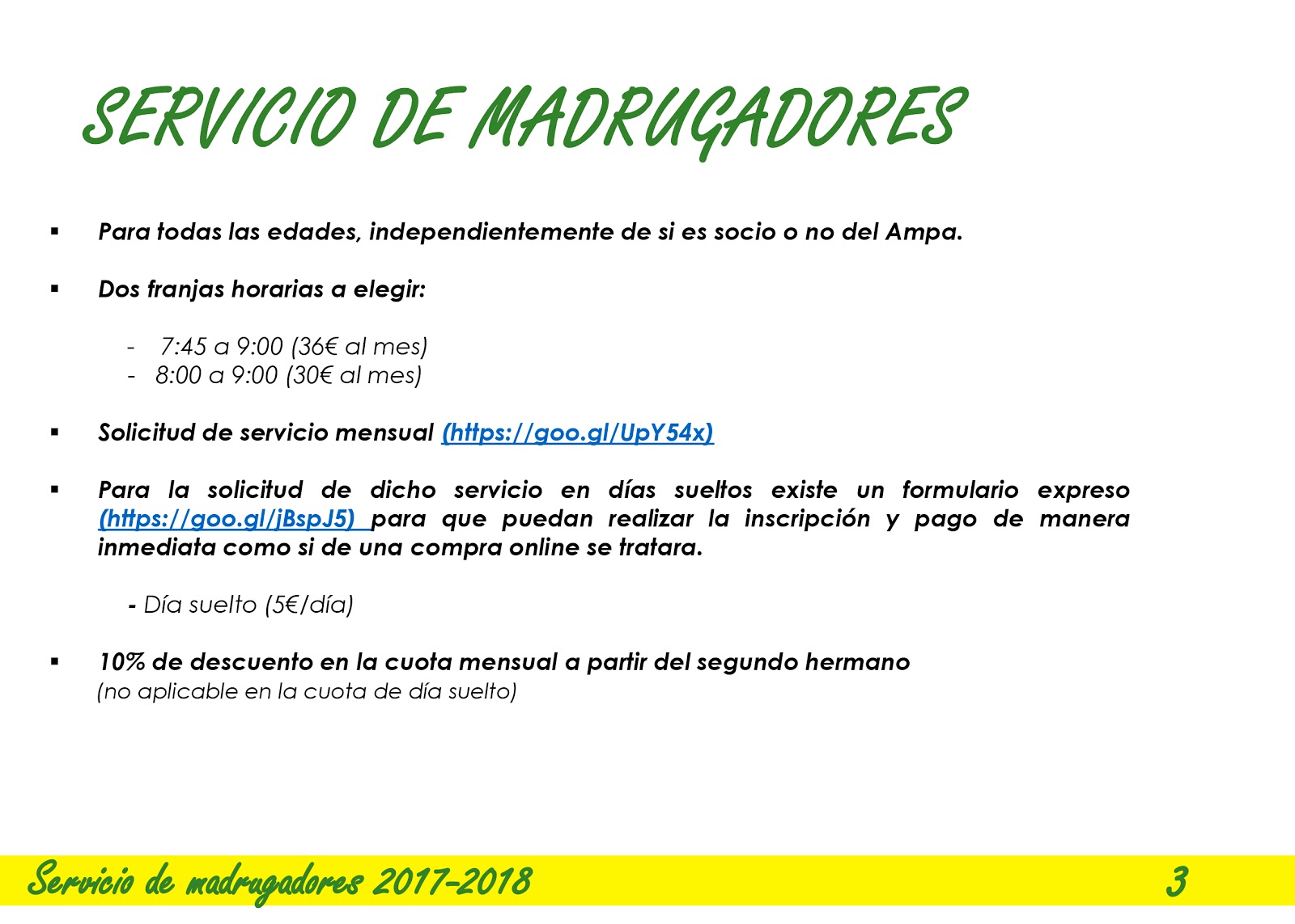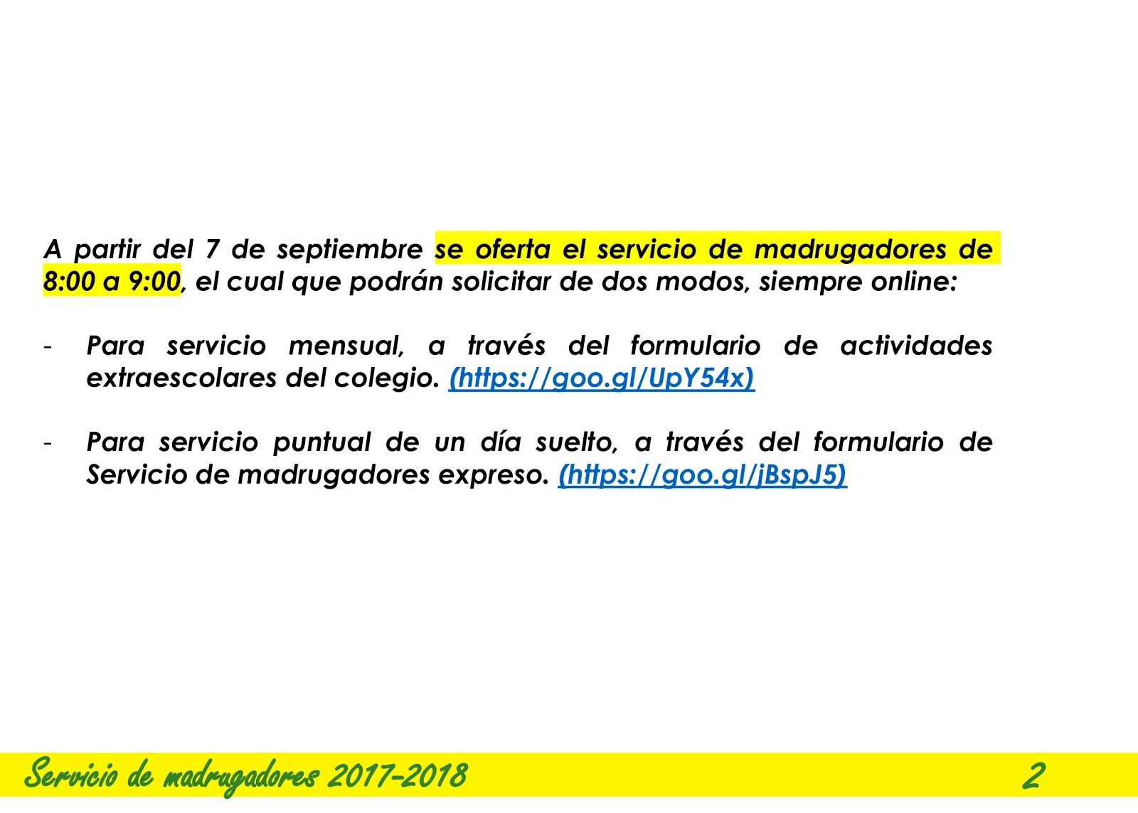 Os adjuntamos la información para el servicio de madrugadores de este curso que empieza en unos días , tenéis la opción de solicitud de servicio mensual o el formulario de días sueltos según os convenga, y toda la información mas abajo. Dejaremos una pestaña en la pagina principal para que podais realizarlo durante todo el curso .