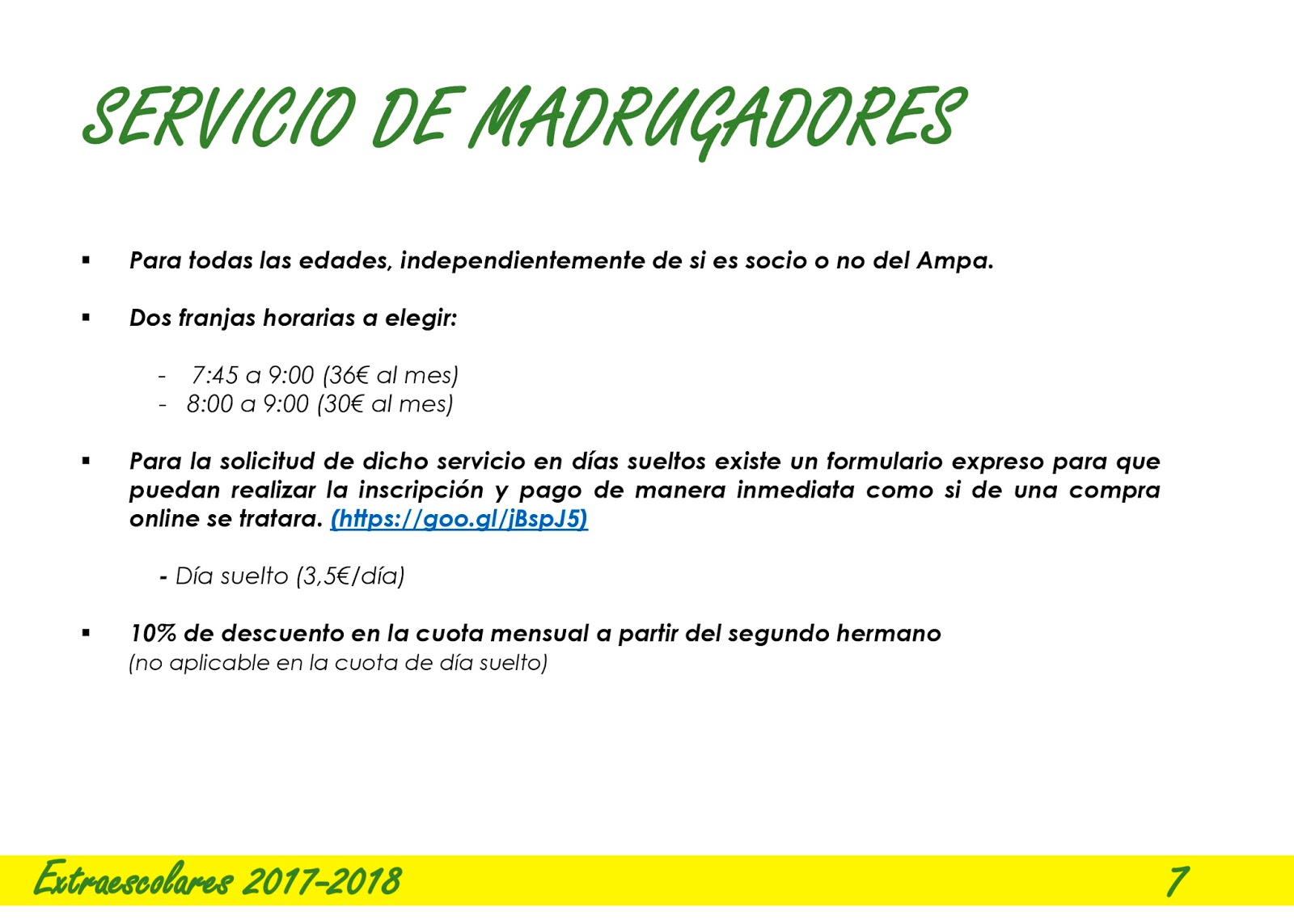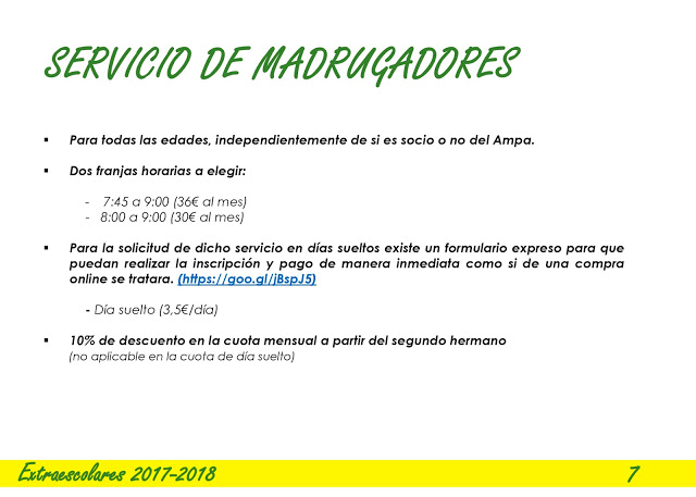 Os dejamos la modificación del precio de madrugadores para días sueltos para el curso que viene , que será de 3,5 €.Dejamos también una pestaña activa en la columna derecha de la pagina para que podáis acceder a ella durante el curso y pagar el servicio de días sueltos.