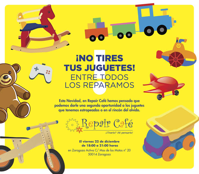 Desde Zaragoza Activa os invitamos a participar en el próximo Repair Café Especial Juguetes que tendrá lugar el 22 de diciembre a las 18 horas en nuestra sede: Antigua Azucarera del Rabal.