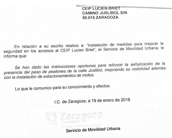 Recogiendo estas demandas el AMPA y el colegio se implicaron, dirigiéndose en varias ocasiones al Servicio de Movilidad Urbana. La respuesta por fin llegó la semana pasada: el ayuntamiento reforzará la visibilidad de este paso de cebra con la instalación de un parking de motos y con la mejora de su señalización.