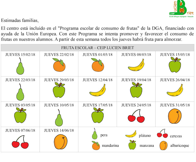 Os dejamos el programa escolar de consumo de frutas del colegio que como todos los años distribuye entre los niños frutas variadas a lo largo del curso. Este curso se realizará los JUEVES. Dejamos una entrada en la columna derecha para que podáis ver semanalmente cual corresponde.