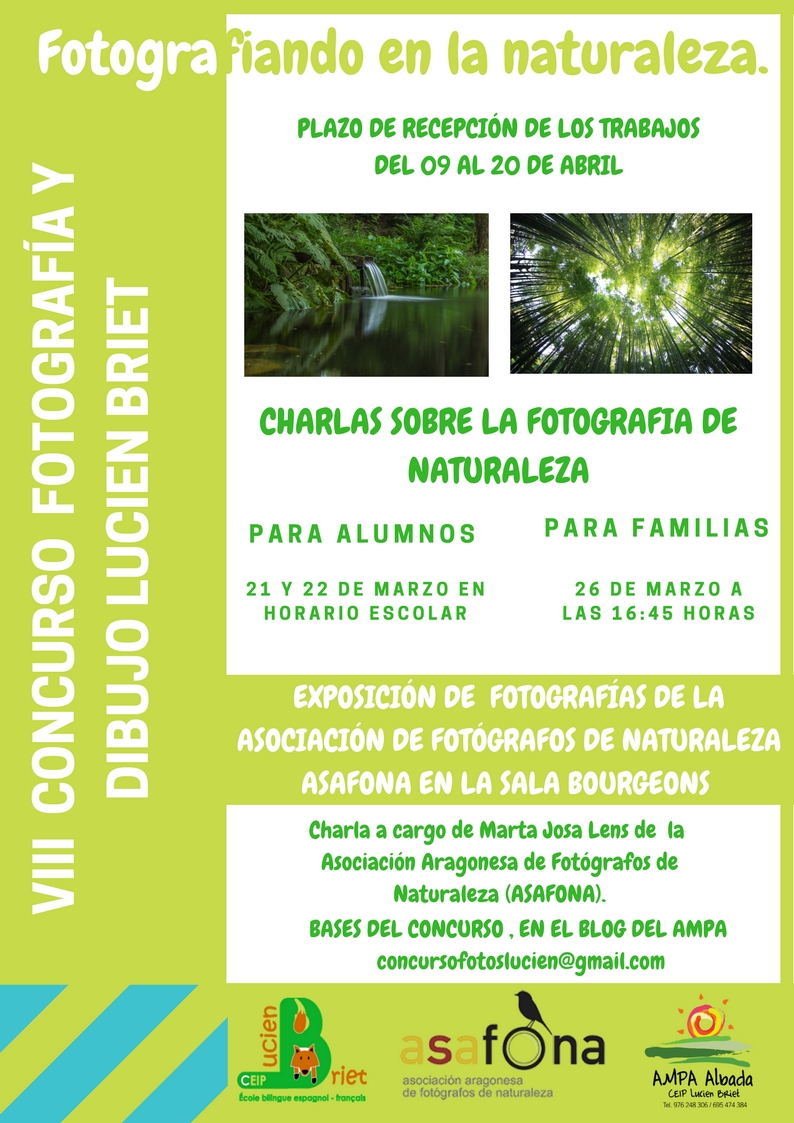 Este año paralelamente contamos en el cole con la colaboración de la Asociación Aragonesa de Fotógrafos de Naturaleza , ASAFONA , http://asafona.es .Gracias a la invitación que le han hecho por parte del colegio realizarán dos charlas para los niños los días 21 y 22 de marzo en horario escolar y una charla para las familias el 26 de marzo a las 16:45 h en la sala Bourgeons, donde además desde el día 21 han montado una exposición de fotografías realizadas por la Asociación y que podéis pasar a visitar por las tardes y a los que agradecemos desde aquí su colaboración.