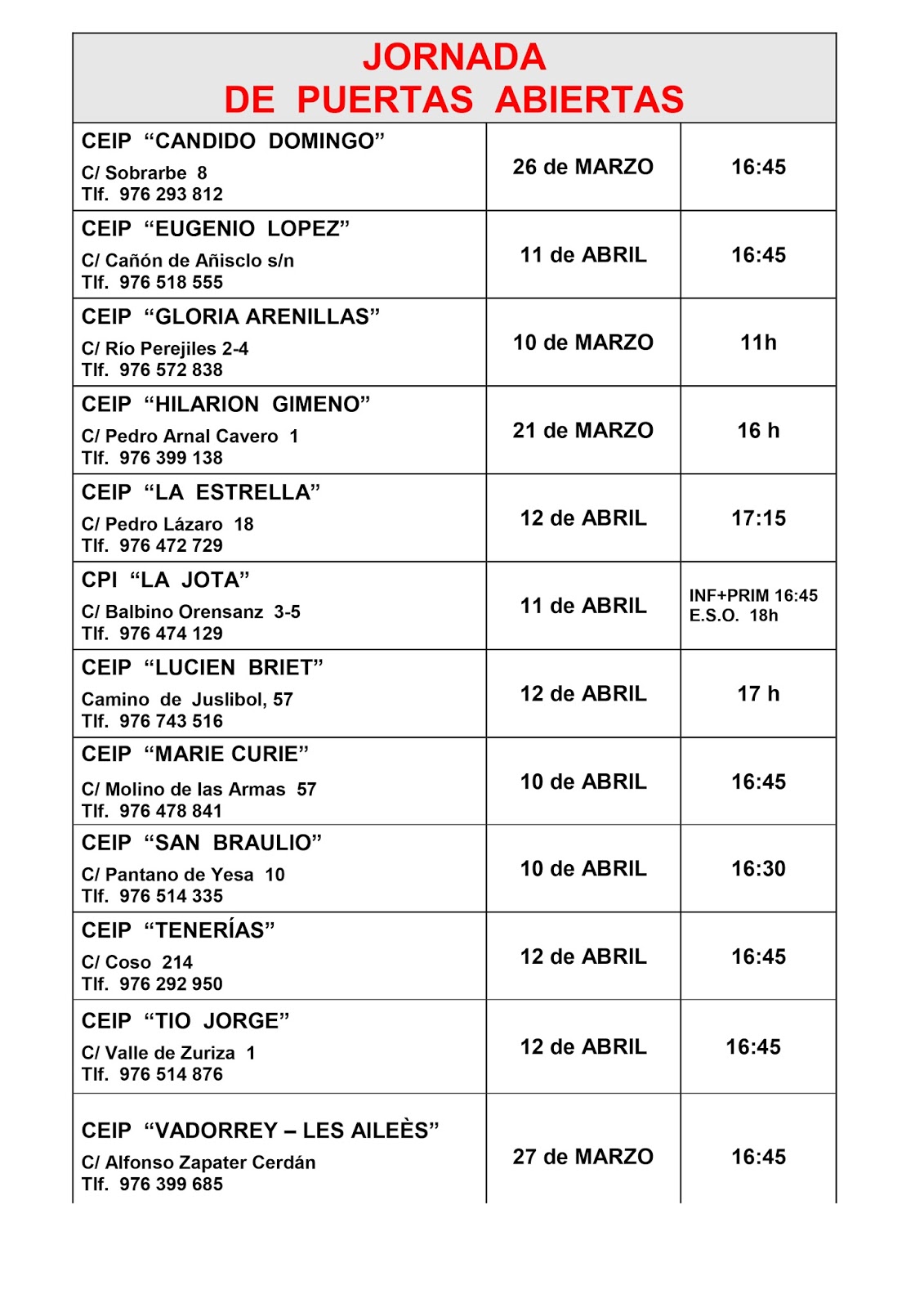 Os dejamos el periodo de jornada de puertas abiertas de los colegios de la zona, recordad que el día de puertas abiertas en nuestro cole es el 12 de abril a las 17 horas