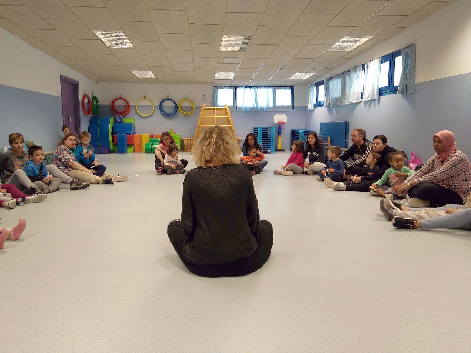 Empezamos con un taller de mindfulness dirigido por Maite Grau, graduada social e instructora de esta disciplina. Aprendimos a a tomar conciencia de nuestro cuerpo a través de la respiración, los movimientos y las caricias, trabajando en pareja con nuestros peques.
