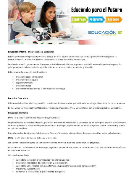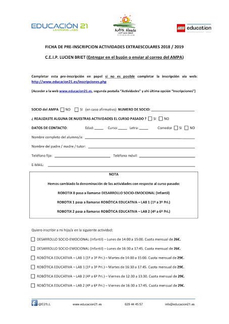 Os dejamos la información de la extraescolar que la empresa EDUCACION 21 nos propone para los niños del cole que quieran aprender robótica, podéis descargar el pdf de la actividad desde aquí y para inscribiros tenéis que entregar la inscripción en el buzón del ampa descargandola desde AQUI o también lo podéis hacer desde la dirección www.educacion21.es/inscripciones.php