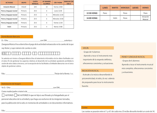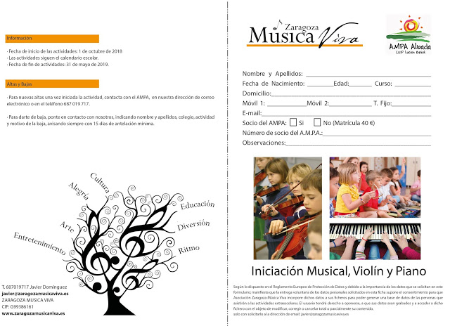 Os dejamos la información de la extraescolar de Zaragoza MÚSICA VIVA para este curso. Tenéis la información de los horarios y las actividades mas abajo o también podéis descargarla desde AQUÍ