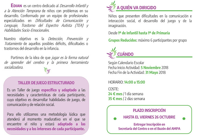 Es un Taller de juego específico y adaptado a las necesidades y características de cada participante, cuyo objetivo es desarrollar habilidades de juego, de comunicación y de relación social.